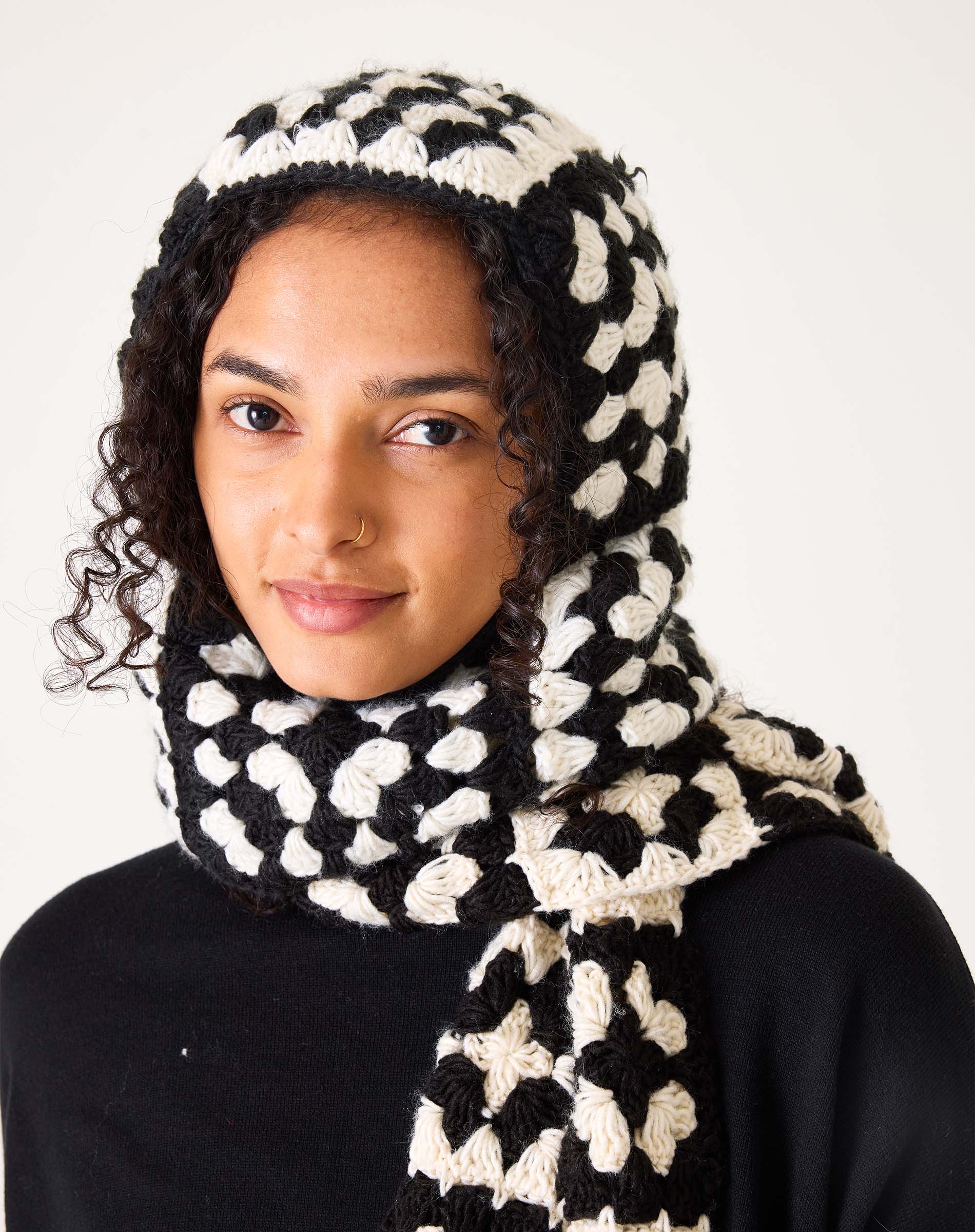 Original, chic, crochet—three traits we gladly invite into our closet. From fall in cities all over the world, to cold days somewhere in the mountains, this balaclava is as warm as it is a showstopper. Pair it with the scarf & fingerless gloves for the ultimate style-out no matter where your winter takes you.